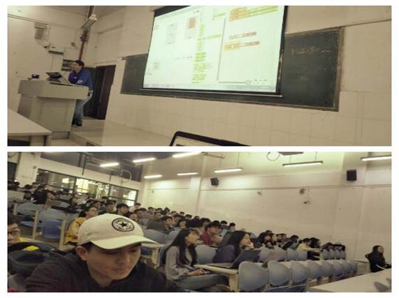 在“思政育人•健康重电•大国工匠”——太阳成集团tyc151cc职教活动周,公司组织了面向2017级和2018级嵌入式专业的Scratch创意编程设计大赛。并于2019年5月7日上午在7栋的两个多媒体教室分别进行了培训。由于报名参赛的人数较多,2017级的同学由杨玉平老师负责在7-210进行培训,2018级的同学由王伟强老师负责在7-204进行培训。