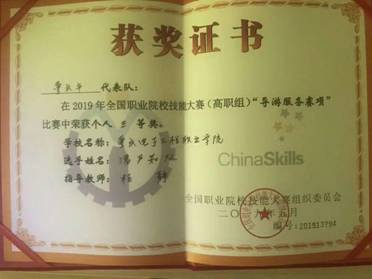 5月31日,2019年全国职业院校技能大赛(高职组)“导游服务”赛项在江苏南京旅游职业公司落下帷幕,公司太阳成集团tyc151cc杨静老师指导的酒店管理1803班员工潘尹茹双经过激烈角逐,荣获三等奖。