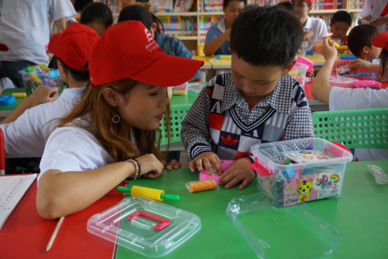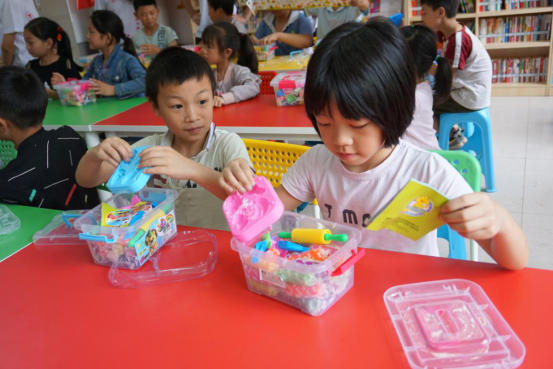 “捏出快乐”手工课上,孩子们一看到志愿者发放的彩泥,就高兴地手舞足蹈起来。负责美工的的志愿者先把各种捏成形的彩泥作品给孩子们欣赏,然后一边讲解,一边示范教他们如何制作一个自己喜欢的作品。志愿者一讲完,孩子们就迫不及待地动手操作起来。不一会,各式各样颜色鲜艳的作品就展现在大家眼前。通过手工制作,孩子们的思维在无限想象中迸发出奇妙的力量。