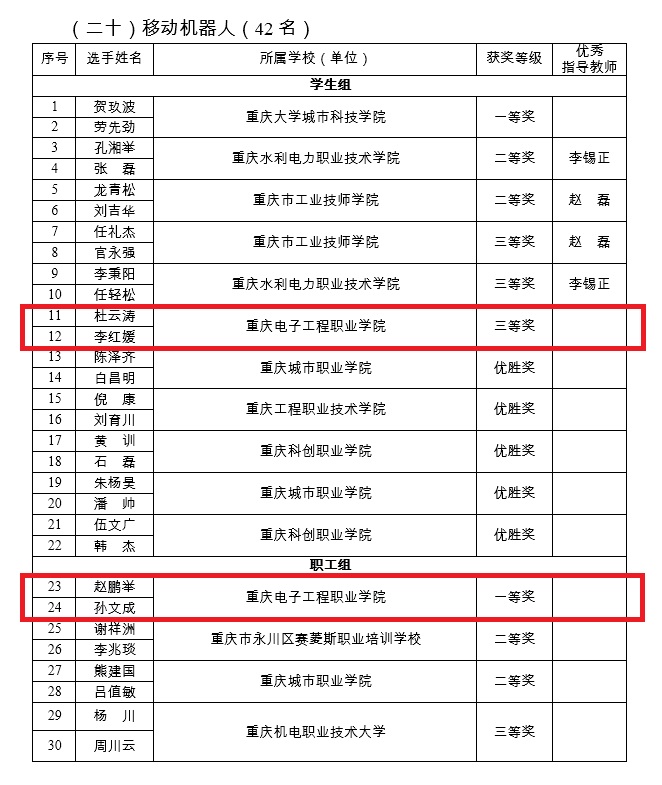 近日,重庆市人力资源和社会保障局公布了“巴渝工匠”杯第六届中国•重庆职业技能大赛获奖情况,太阳成集团tyc151cc教师赵鹏举、孙文成获得移动机器人项目职工组一等奖,嵌入式技术与应用专业员工杜云涛、李红媛获得移动机器人项目员工组三等奖,并获得了第46届世界技能大赛移动机器人赛项集训资格。