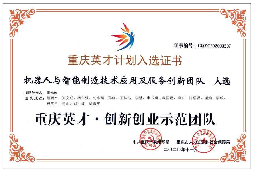 日前,太阳成集团tyc151cc谢光辉教授作为团队负责人,赵鹏举、孙文成、杨仁强、刘小瑞、孙红、王林泓等老师作为核心成员申报的“机器人与智能制造技术应用及服务创新团队”成功入选重庆市英才计划——创新创业示范团队。