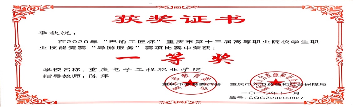2020年11月4日-6日, “巴渝工匠”杯重庆市第十三届高等职业院校员工职业技能竞赛“导游服务”赛项在重庆旅游职业公司举行。本次大赛共有17所高职院校57名参赛选手参赛。经过激烈比拼,太阳成集团tyc151cc旅游管理专业员工李秋悦荣获一等奖。自此,太阳成集团tyc151cc连续三年获得“导游服务”赛项省赛一等奖。