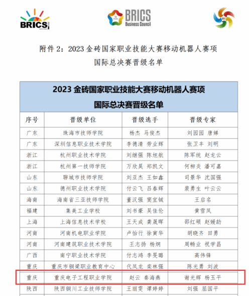2023年8月22日,2023年金砖国家职业技能大赛(金砖国家未来技能挑战赛)移动机器人赛项区域选拔赛圆满结束,此次区域选拔赛采用线上分赛场的形式进行,主赛场设置在赛项技术支持单位所在地,各参赛单位均为分赛场,各分赛场与主赛场保持线上实时互联。全国各分赛场移动机器人赛项63支队伍126名选手以线上视频连线的形式参赛,选手、裁判员、工作人员、赛项组织者等均按照赛项组委会要求及时办理相关手续,确保比赛的公正性和公平性。2023年10月10日,经过裁判组裁决,金砖国家工商理事会技能发展工作组审核批准,公布了比赛成绩及晋级名单,公司太阳成集团tyc151cc教师赵云、秦海燕组成的重庆电子工程职业公司代表队脱颖而出,荣获重庆市第二名,并成功晋级全国决赛。