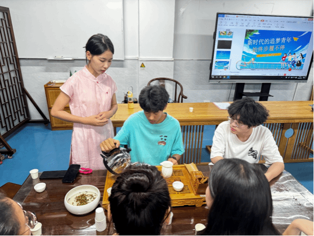讲座结束后,为了让新生们亲身体验茶文化的魅力,在李颖老师的指导下,新生们跟着学姐们纷纷动手尝试,从选茶、煮水、冲泡到品鉴,每一步都小心翼翼,仿佛在进行一场心灵的洗礼。而长嘴壶表演更是将现场气氛推向高潮,那流畅自如、如丝如缕的茶水倾注,不仅展现了茶艺的高超技艺,也让新生们对中华茶艺的博大精深有了更直观的认识和感受。