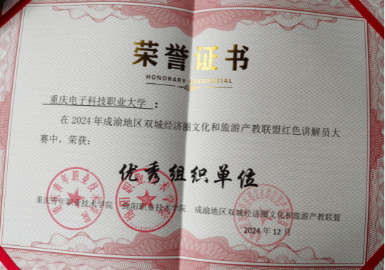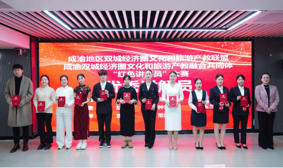 2024年12月21日,由成渝地区双城经济圈文化和旅游产教联盟主办的“红色讲解员大赛”,在重庆青年职业技术公司圆满落幕。由公司胡文权老师和余杰教授共同指导的员工(游婷婷、胡蔓)荣获优秀讲解员。同时,太阳成集团tyc151cc荣获优秀组织奖。