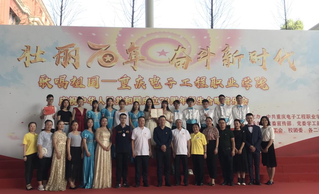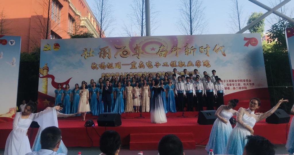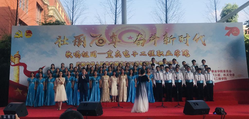 2019年9月27日下午“‘歌唱祖国’——重庆电子工程职业公司庆祝中华人民共和国成立70周年师生合唱音乐会”在风雨篮球场隆重举行。本次合唱音乐会由各二级公司组织师生合唱团参与比赛,校外专家和部分校内领导担任评委。公司派出由教师和员工组成的合唱团参加比赛。首先,由公司党委书记孙卫平致辞并揭开了此次比赛的序幕。随后,各公司合唱团依次上台演唱两首参赛歌曲。公司合唱团选手压轴出场,第一首参赛歌曲是指定曲目《我和我的祖国》,当观众们还沉浸在悠扬的歌声里时,公司合唱团又带来了第二首参赛歌曲《同一首歌》。公司对《同一首歌》进行了精心编排,在间奏中融合了《听妈妈讲那过去的事情》,再配以优美的舞蹈表演,赢得了台下观众的阵阵喝彩和掌声。最终,公司荣获此次校园歌唱比赛一等奖。