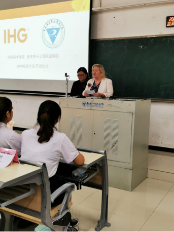 开班仪式上,首先主持人介绍合作办学双方领导人。国际交流合作处莫绍强处长代表公司致欢迎词并发言。Sharon Fraser 富莎瑞代表洲际集团发言,非常重视合作办学模式,感谢我方提供的支持,希望英才班越办越好,培养更多的酒店行业优秀人才。接着,两名英才班员工代表誓师发言。 开班仪式后,重庆富力假日酒店培训部王梦真 Anne副经理进行现场授课。