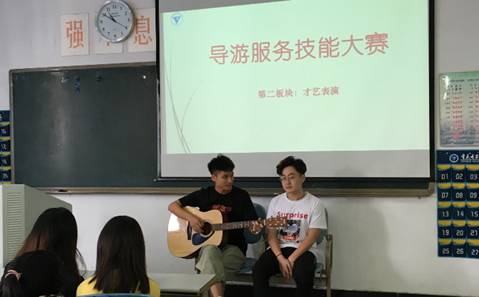 5月10日上午9点在9-605教室进行了本次活动竞赛展示部分,6个组分别进行5分钟的导游词讲解、3分钟的才艺表演。重庆的美景、美食、民俗、历史文化……在同学们的介绍下,生动形象、令人向往;吉他弹唱、吟诗朗诵、集体合唱……同学们十八般“武艺”展风采,师生们共同享受了一场视听盛宴。